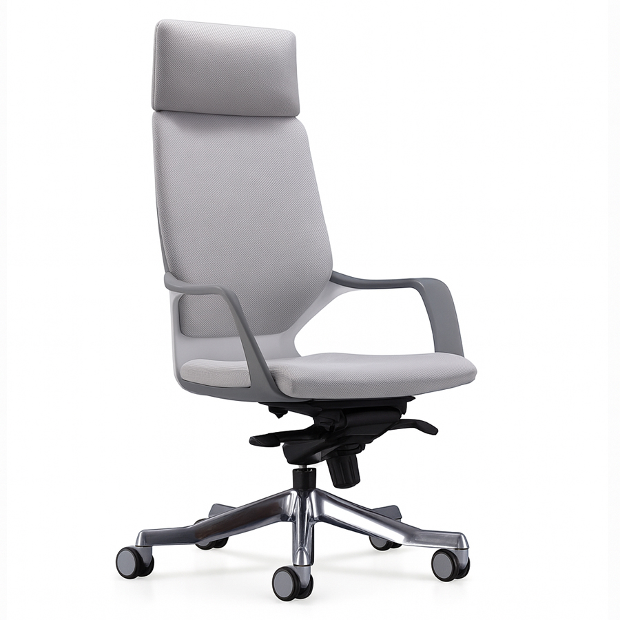 • The High Back Executive Chair in light grey fabric offers a sleek and contemporary design suited for professional office environments.
