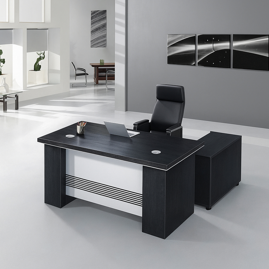 - Modern Executive Design: Elegant and professional, this desk features a bold black wood finish with a striking white accent panel.