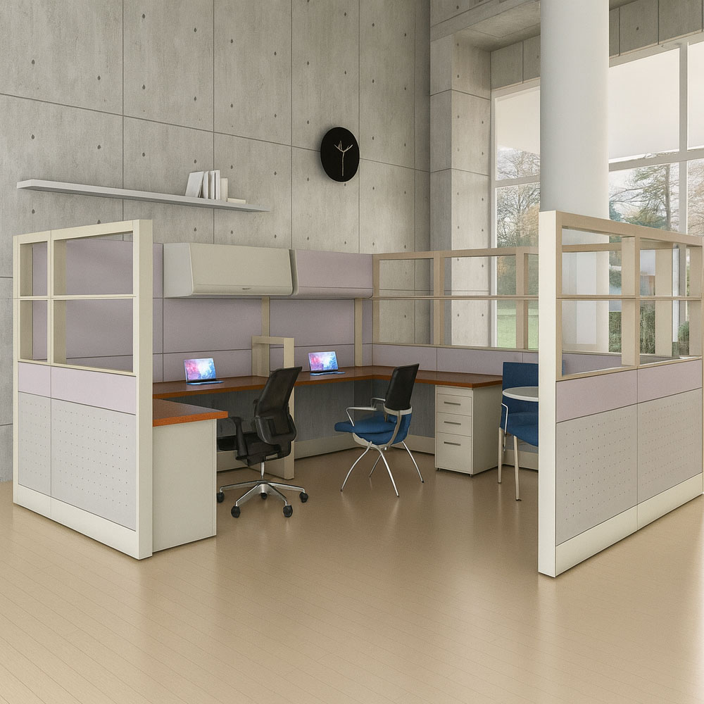 • Lavender & White Modern Color Scheme: A soft lavender panel finish combined with clean white framing creates a warm, contemporary, and professional office environment.