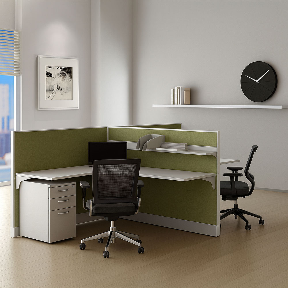 • 2-person L-shaped workstation with olive green privacy panels.
